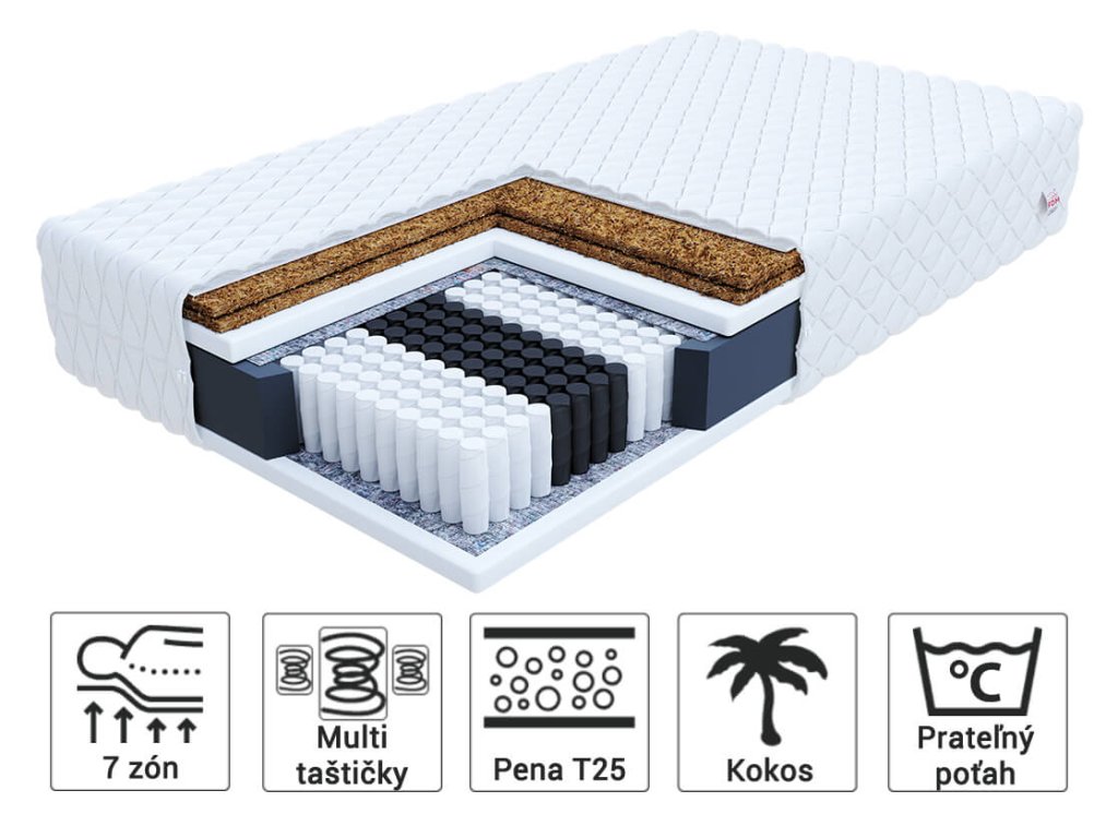 Materiálové zloženie: Filc, NanoHARD multi taštičkové pružiny, Polyuretánová pena T25, Kokosová vrstva, Poťah