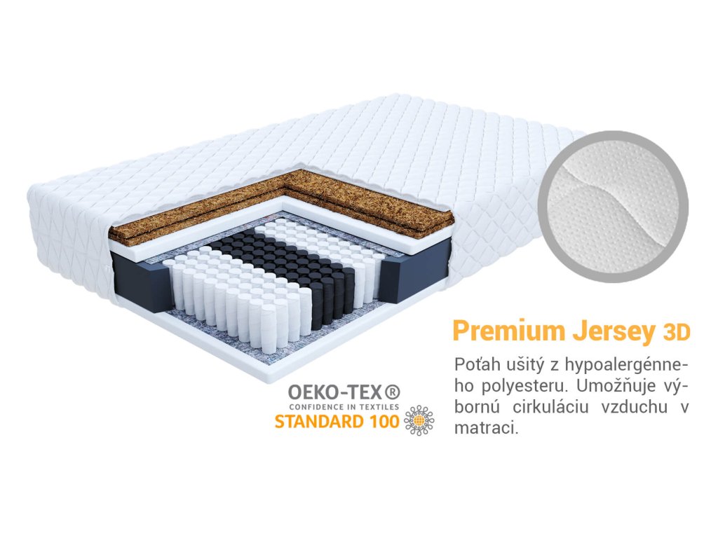 Zdravotný matrac je chránený vďaka prešívanému odnímateľnému poťahu Premium Jersey 3D. Je vyrobený z najkvalitnejších hypoalergénnych materiálov. Vďaka kvalitným materiálom vám pomôže predĺžiť životnosť matraca. Je typickým vysokou odolnosťou voči nečistotám, ľahkosťou a sviežosťou. Premium Jersey poťah poskytuje matracu správne prúdenie vzduchu a dobré vetranie, navyše sa poťah môže prať v práčke na 30 °C. Poťah má zips na ľahšiu manipuláciu.