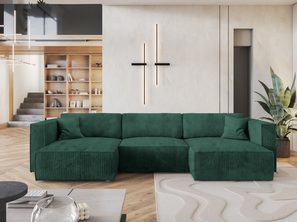 Oživte svoj interiér účkovou sedacou súpravou Sarmo P v tvare U, ktorá zaujme elegantným tmavozeleným odtieňom a jemnou menčestrovou látkou Poso. Látka je príjemná na dotyk, odolná voči oderu a dodáva priestoru sofistikovaný a útulný charakter. Vlnité pružiny spolu s polyuretánovou penou zabezpečia komfortné sedenie aj pohodlné ležanie. Celoplošné čalúnenie umožňuje umiestniť pohovku aj do stredu miestnosti a jej veľkorysý tvar u poskytuje dostatok miesta pre rodinu alebo hostí.