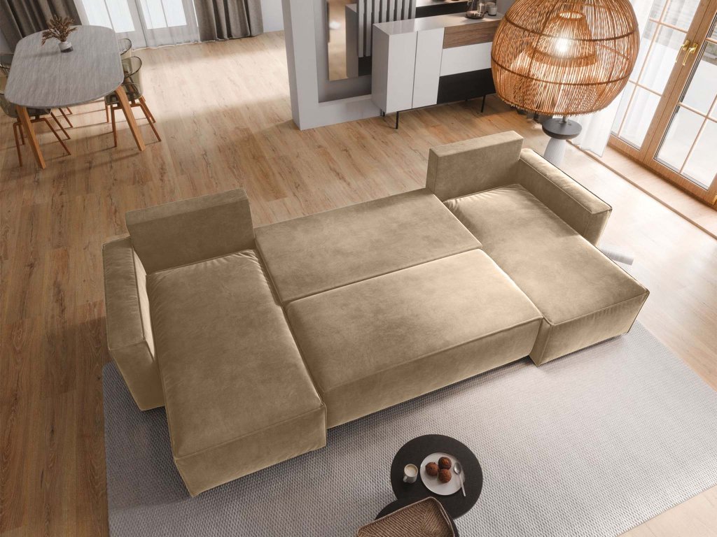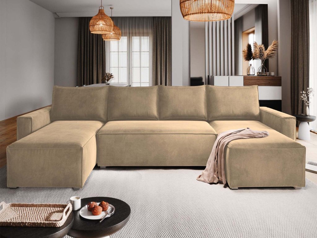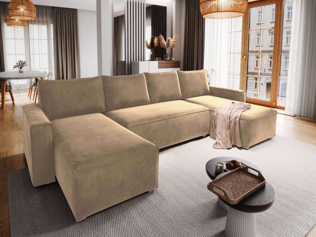 Pohovka Denim ponúka rozkladaciu funkciu a počas chvíľky sa premení na priestranné lôžko pre hostí. Pod sedacou časťou sa ukrýva úložný priestor – ideálny na posteľnú bielizeň či sezónne veci. Stabilná konštrukcia z kvalitných materiálov, pevné nohy a výplň z polyuretánovej peny T30 zaručujú dlhú životnosť aj pri každodennom používaní. Krémové čalúnenie dodá obývačke ľahkosť a luxusný vzhľad, ktorý nikdy neomrzí.