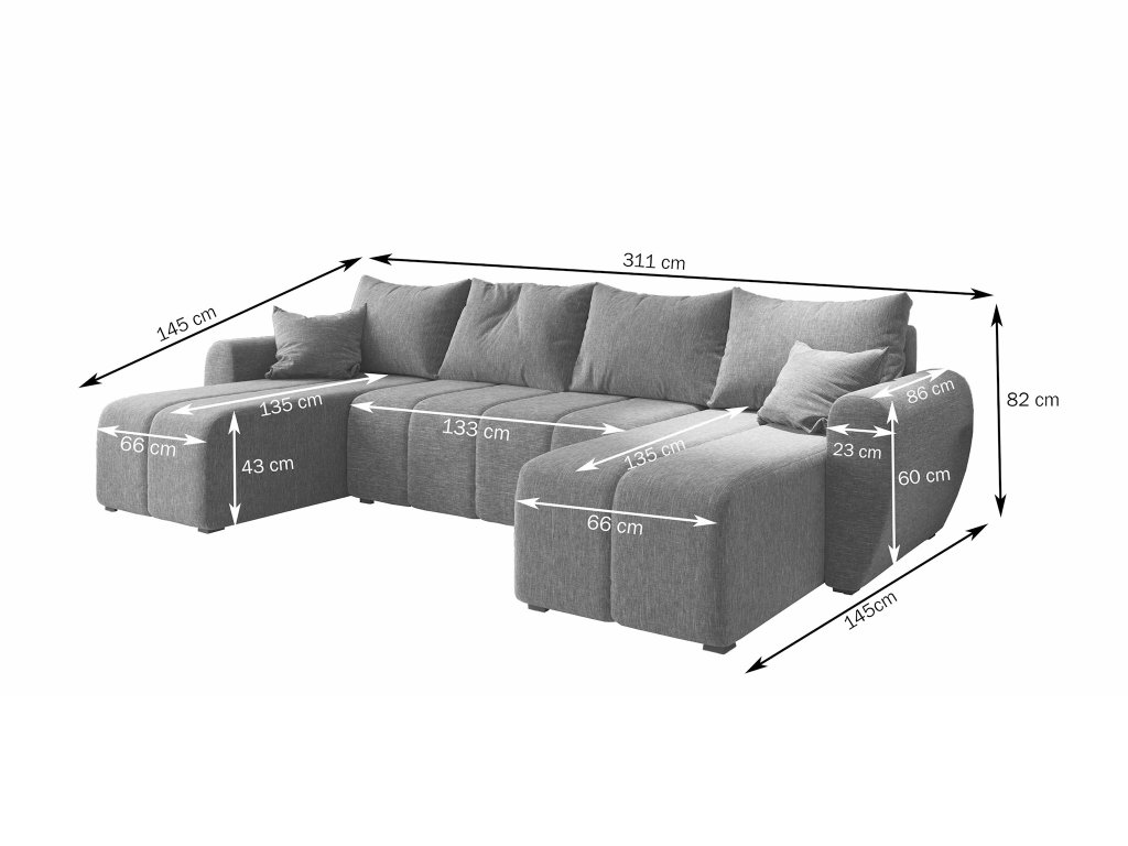 Objavte výnimočné pohodlie a nadčasový štýl s rohovou sedačkou v tvare U Madeson v elegantnej čiernej farbe. Tento model v tvare U je ideálnym miestom na každodenný odpočinok aj spoločné chvíle s rodinou či priateľmi. Mäkké podrúčky, pružiny a pena T25 v sedacej časti zaručujú dokonalý komfort pri sedení aj ležaní. Vďaka rozkladacej funkcii sa pohovka jednoducho premení na priestranné lôžko, ktoré oceníte pri návštevách alebo počas pokojného víkendového leňošenia.