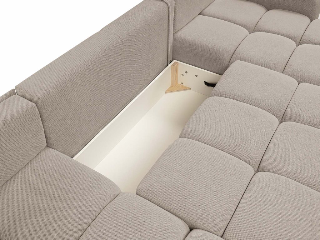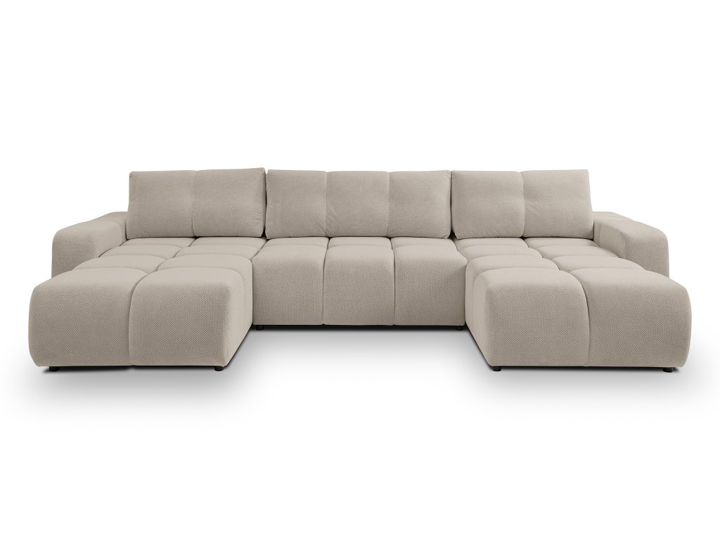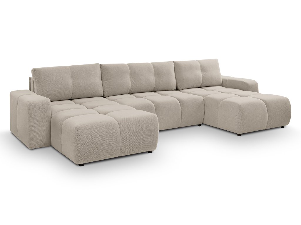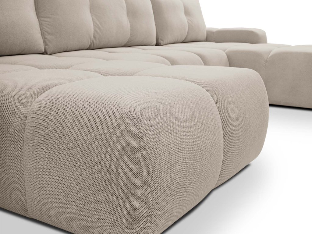 Sedačka Soho v béžovej farbe vám poskytne komfort vo vašej obývačke. Jej praktický tvar do U ponúka dostatok priestoru pre celú rodinu aj návštevy, takže spoločné chvíle budú ešte príjemnejšie. Okrem priestrannosti vás poteší aj funkciou rozkladu na pohodlné lôžko, ideálne na príležitostné spanie. Praktický úložný priestor využijete na deky, posteľnú bielizeň či sezónne vankúše. O maximálne pohodlie sa stará kvalitná PUR pena T-3042 a T-2542, ktorá zaisťuje mäkkosť sedadiel. Stabilitu a pevnosť konštrukcie zabezpečuje rám z borovicového dreva, HDF dosky, preglejky a drevotriesky. Opierky na ruky vyplnené PUR penou T-3042 a operadlo s penou T-1620 poskytujú potrebnú oporu pri oddychu. Celý dizajn dopĺňajú čierne plastové nožičky, ktoré sedačke dodávajú moderný vzhľad.