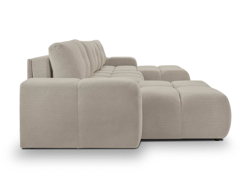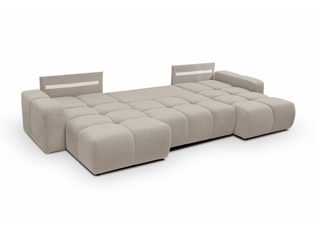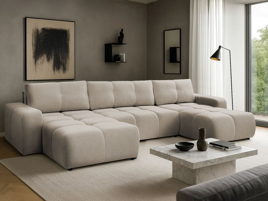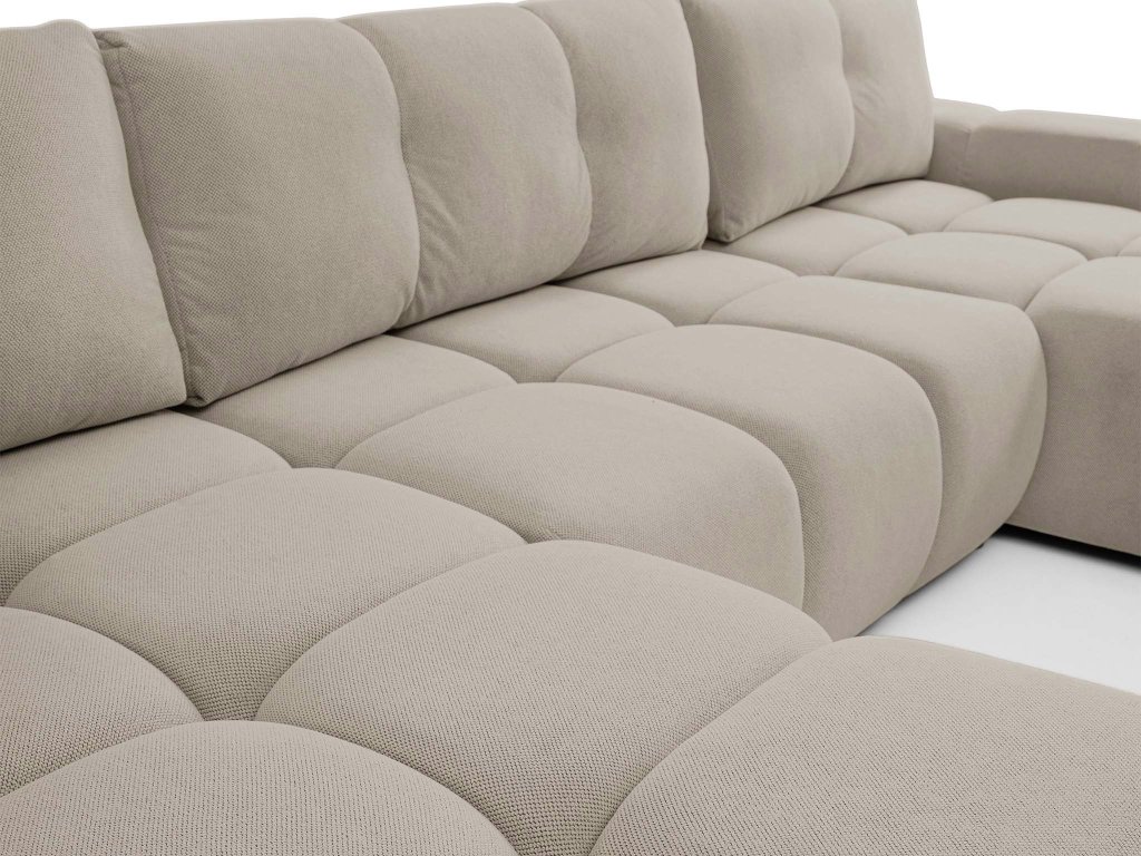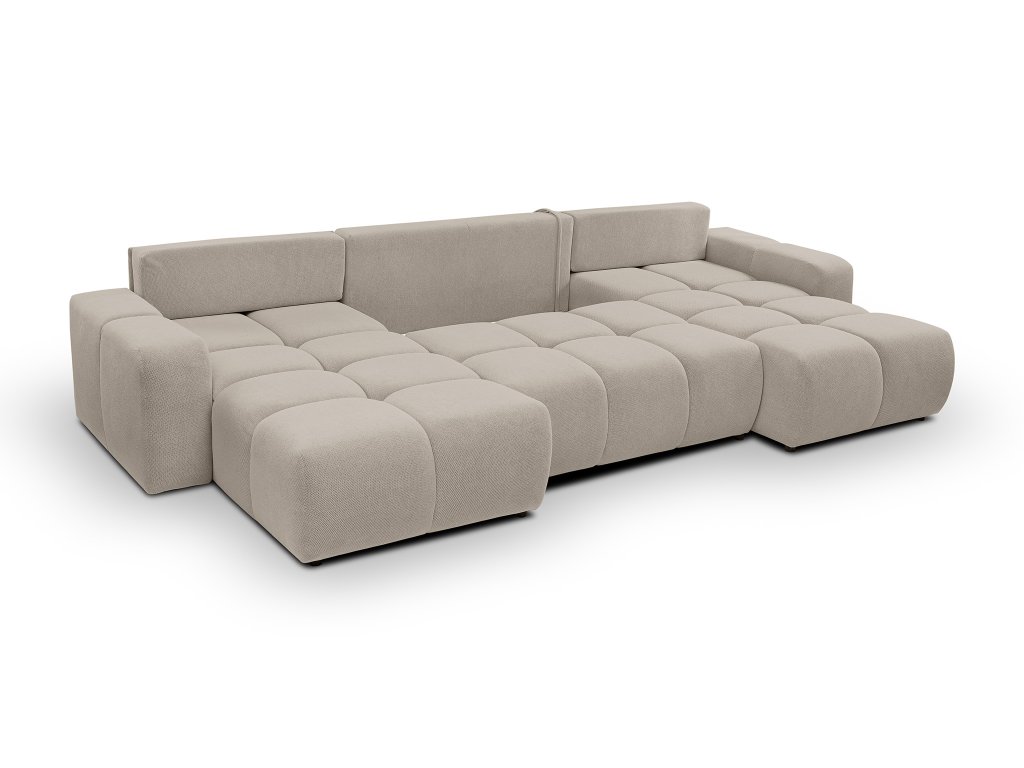 Sedačka Soho v béžovej farbe vám poskytne komfort vo vašej obývačke. Jej praktický tvar do U ponúka dostatok priestoru pre celú rodinu aj návštevy, takže spoločné chvíle budú ešte príjemnejšie. Okrem priestrannosti vás poteší aj funkciou rozkladu na pohodlné lôžko, ideálne na príležitostné spanie. Praktický úložný priestor využijete na deky, posteľnú bielizeň či sezónne vankúše. O maximálne pohodlie sa stará kvalitná PUR pena T-3042 a T-2542, ktorá zaisťuje mäkkosť sedadiel. Stabilitu a pevnosť konštrukcie zabezpečuje rám z borovicového dreva, HDF dosky, preglejky a drevotriesky. Opierky na ruky vyplnené PUR penou T-3042 a operadlo s penou T-1620 poskytujú potrebnú oporu pri oddychu. Celý dizajn dopĺňajú čierne plastové nožičky, ktoré sedačke dodávajú moderný vzhľad.