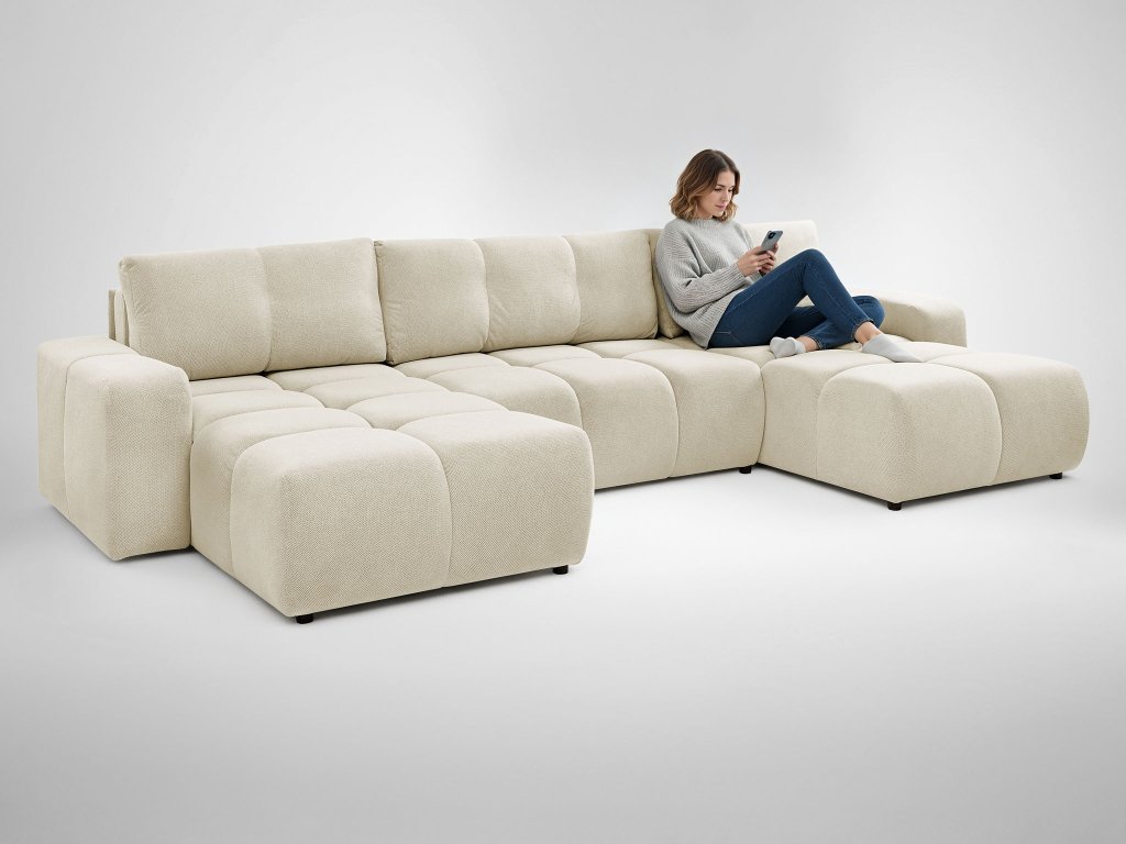 Vytvorte si vo svojej obývačke miesto, kde sa budete radi vracať po náročnom dni. Sedačka Soho v krémovej farbe, navrhnutá v praktickom tvare U, ponúka dostatok miesta nielen pre celú rodinu, ale aj pre všetkých vašich hostí. Táto rozkladacia sedačka vás presvedčí aj svojimi benefitmi. Vďaka rozkladacej časti jednoducho vytvoríte pohodlné lôžko na príležitostné spanie. Úložný priestor zas oceníte pri ukladaní diek, posteľnej bielizne alebo sezónnych vankúšov. O vašu pohodu sa postará kvalitná PUR pena T-3042 a T-2542, ktorá zabezpečuje mäkkosť sedadiel. Rám je vyrobený z kombinácie borovicového dreva, HDF dosky, preglejky a drevotriesky, čo zaručuje pevnosť a stabilitu celej konštrukcie. Opierky na ruky vyplnené PUR penou T-3042 a operadlo s penou T-1620 poskytujú príjemnú oporu a komfort pri oddychu. Dizajn sedačky dotvárajú čierne plastové nožičky.