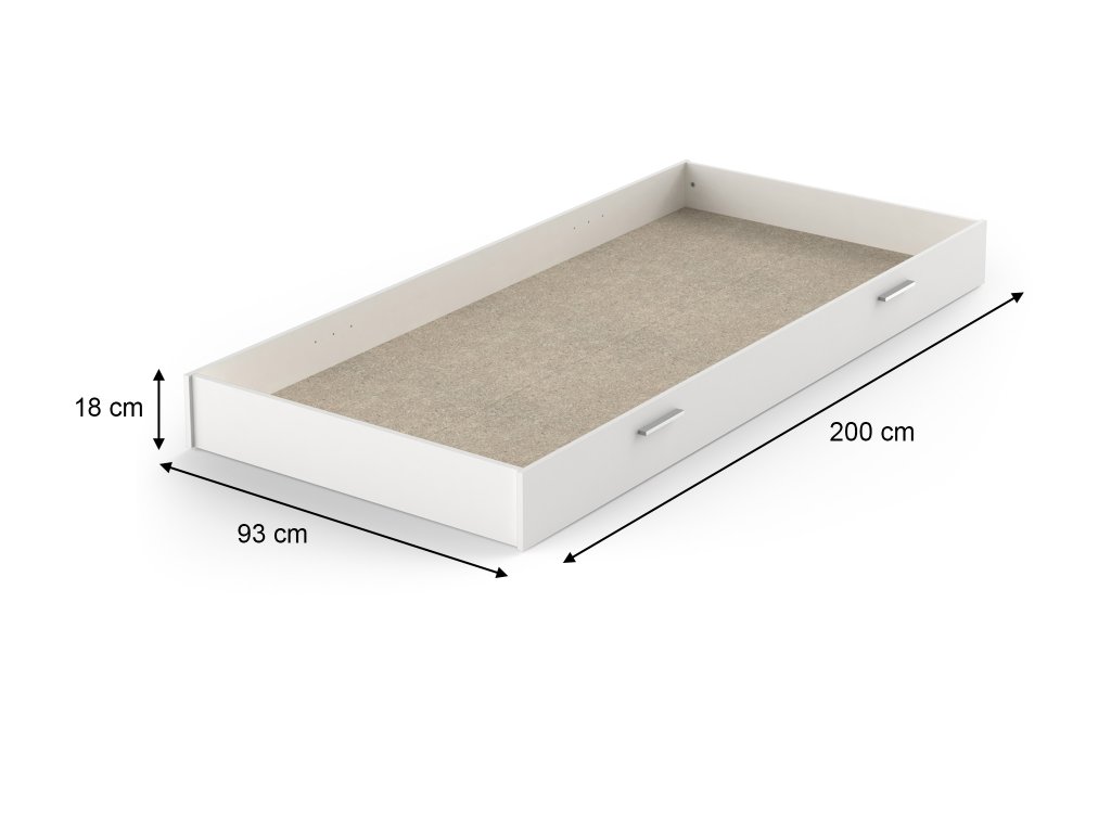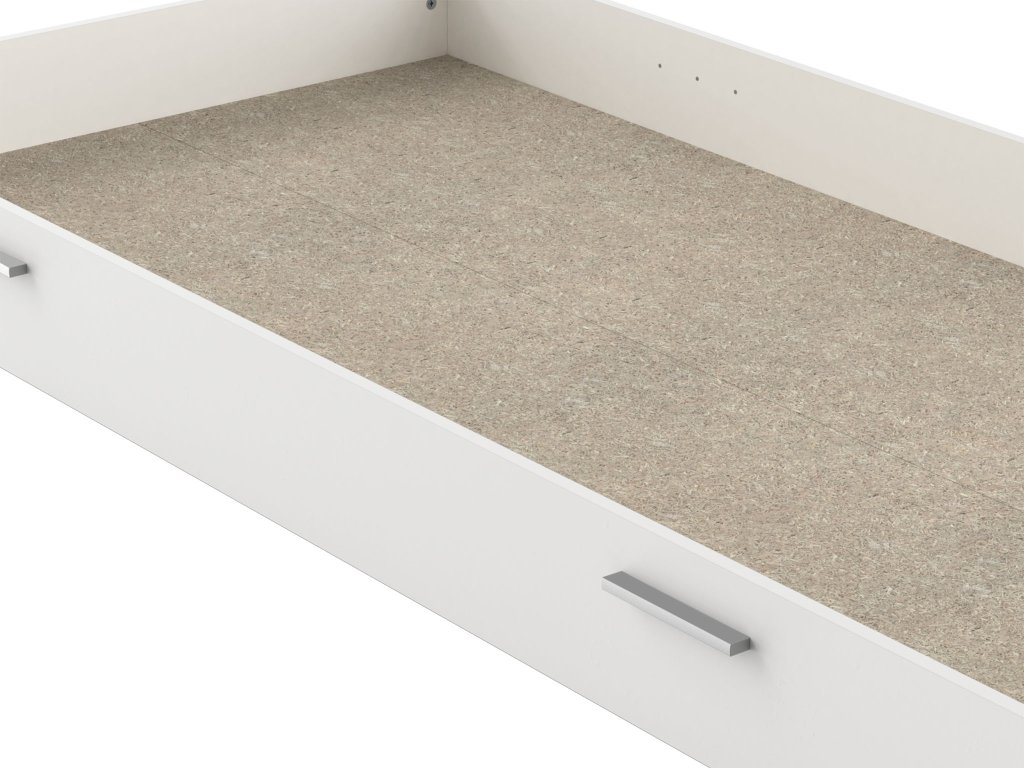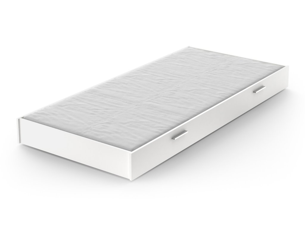 Zásuvka je vybavená kolieskami pre ľahkú manipuláciu, takže jej vysúvanie a zasúvanie je plynulé a nenáročné. Vyhotovenie v matnej bielej farbe dokonale ladí s posteľou Life. Vyrobená je z odolného laminátu s hrúbkou 15 mm, čo zaručuje jej pevnosť a dlhú životnosť. Vnútorná doska, ktorá je súčasťou zásuvky, umožňuje jednoduchú premenu na prístelku alebo na úložný priestor podľa aktuálnych potrieb.