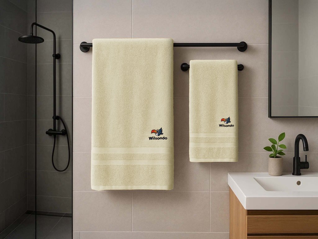 Uterák dopĺňa jemný lem a decentné vyšívané logo Wilsondo, ktoré mu dodáva elegantný vzhľad. Hodí sa k modernému aj klasickému zariadeniu kúpeľne.