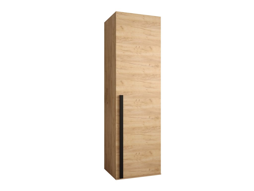 Šatníková skriňa Miro v odtieni zlatý dub craft dodá vášmu interiéru jedinečný štýl. Neutrálne farebné prevedenie jednoducho zladíte s ostatnými kusmi nábytku. Elegantný dizajn dopĺňa plastový úchyt v čiernej farbe, ktorý vám umožní ľahké otváranie a zatváranie jednokrídlových dverí. Úzka skriňa je vyrobená z kvalitnej laminovanej dosky s hrúbkou 16 mm. Hrany skrine sú zabezpečené PVC dyhou. Zadná časť skrine je vyrobená z HDF dosky. Úzka šatníková skriňa Miro má v strede priestor na vešiaky a 2 police z vrchnej aj spodnej strany. Skriňa bude skvelá na odkladanie búnd, topánok ale aj klobúkov. Dvierka na skrini sú univerzálne vďaka čomu si môžete vybrať či sa budú otvárať z pravej alebo ľavej strany. Vyberte si z našej kolekcie Miro aj iné kúsky a vytvorte si jednoduchý a zároveň elegantný interiér.