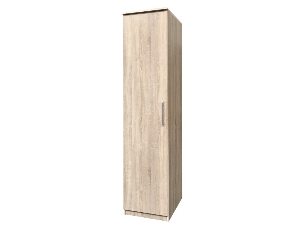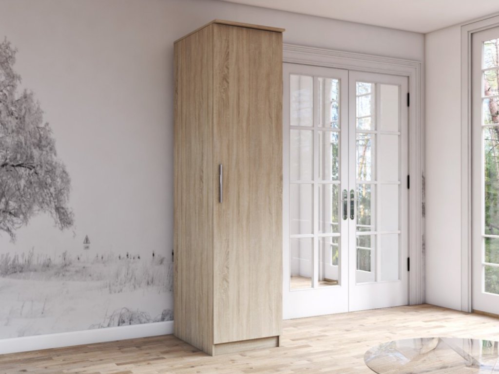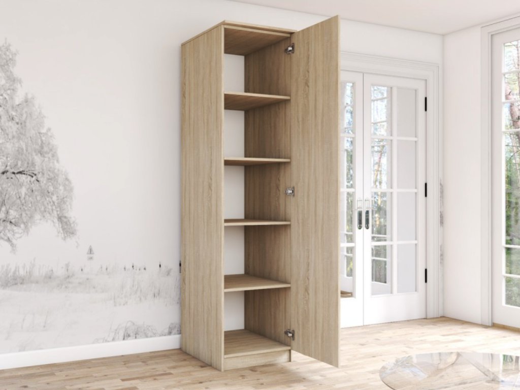 Jednodverová skriňa Biba 1D je vyrobená z vysoko kvalitnej laminovanej dosky (DTD) s hrúbkou 16 mm vo farbe dub sonoma. Skriňa sa vďaka svojmu farebnému prevedeniu prispôsobí mnohým interiérom. Skriňa je vybavená štyrmi priestrannými policami.