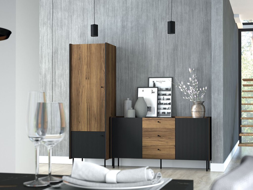 - Materiál: laminovaná doska / čierna drážkovaná MDF / plastové úchytky / kov