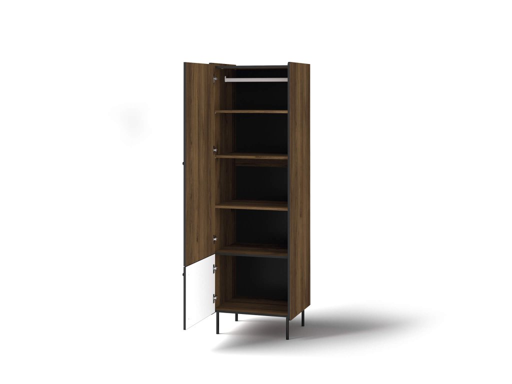 Úzka skriňa Prestigo P2 je stvorená pre milovníkov moderného štýlu. Vďaka jej rozmerom sa zmestí takmer kdekoľvek a jej prevedenie dodá miestnosti ten pravý šmrnc. Jedinečnosť a prestíž tejto skrini zabezpečuje použitie farby orech warmia s farbami San Sebastian a matná čierna. Za hornými dvierkami nájdete štyri police a vešiakovú tyč na šaty. Za spodnými, čiernymi dvierkami sa potom nachádza ešte jedna, samostatne sa zatvárajúca polica. Stabilitu skrini dodávajú štyri kovové nožičky s dĺžkou 16 cm.