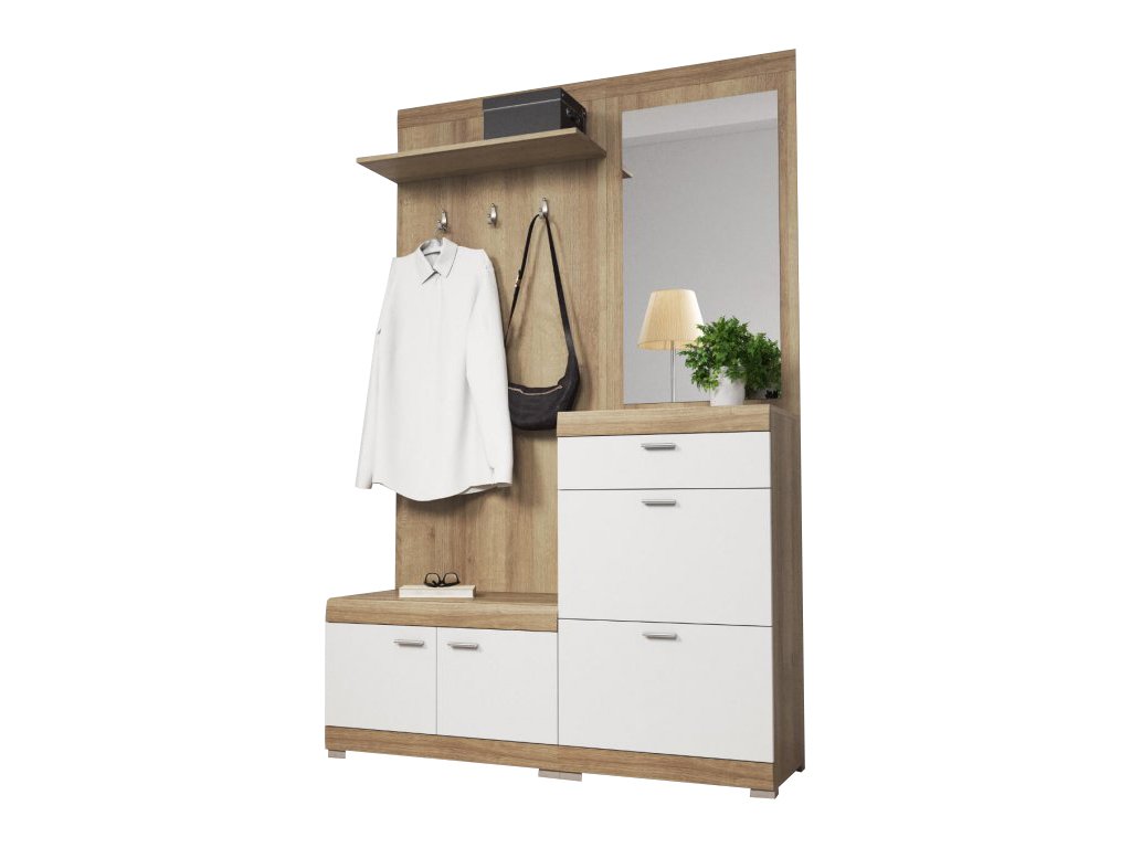 Nábytok do predsiene v modernom štýle, disponuje zrkadlom, 3 vešiakmi, poličkou, 3 skrinkami a zásuvkou. Táto predsieň je vyrobená z kvalitnej laminovanej dosky 16 mm. Hrany sú zakončené 0,5 mm ABS páskou, ktorá je odolnejšia proti každodennému použitiu. Nadčasový jednoduchý dizajn bude pôsobiť dokonale v rámci každého interiéru.