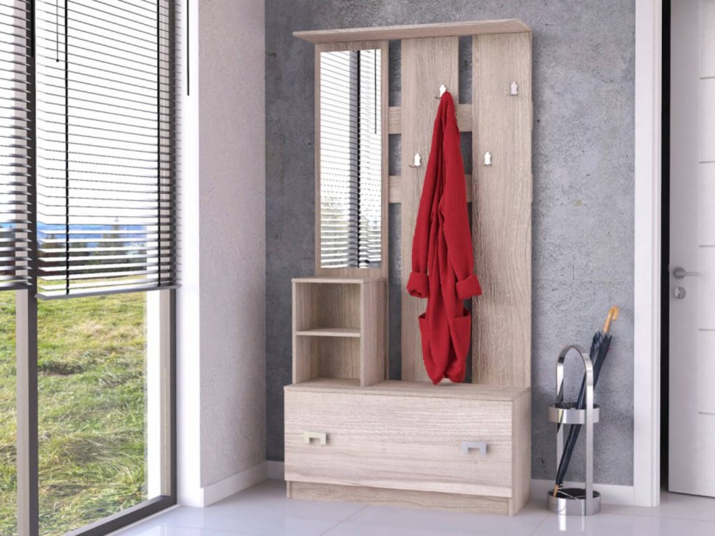 Vešiaková stena Alissa zútulní Vašu predsieň či chodbu. Je vyrobená z vysoko kvalitnej laminovanej dosky o hrúbke 16 mm vo farbe dub sonoma. Moderná vešiaková zostava je vybavená zrkadlom, štyrmi vešiakmi, dvoma otvorenými policami a uzavretého botníka.