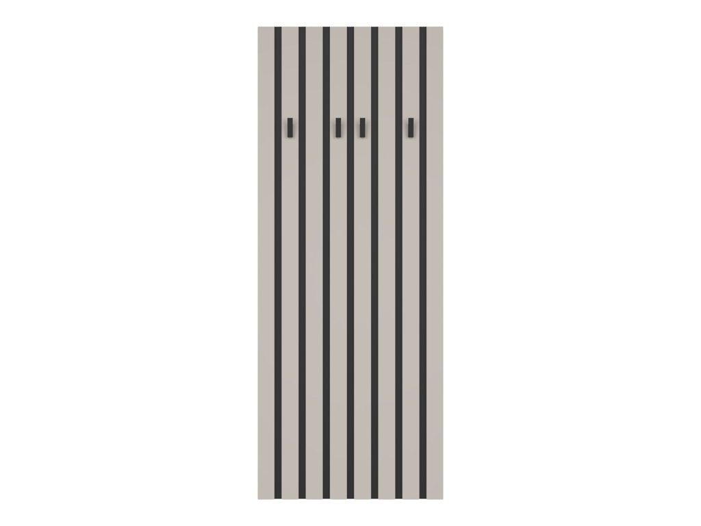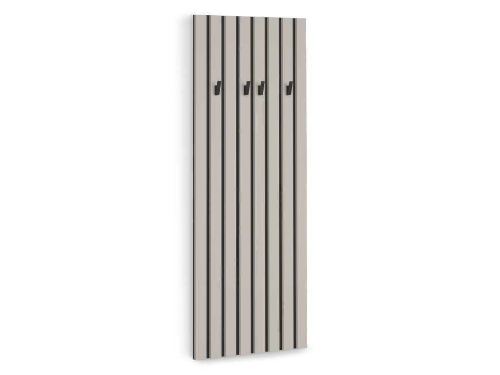 Lamelová vešiaková stena Londia je praktickým a štýlovým doplnkom do predsiene alebo vstupnej haly. Vďaka štyrom vešiačikom umožňuje pohodlné zavesenie kabátov, búnd, šálov či klobúkov, pričom udržuje priestor uprataný a prehľadný. Minimalistický lamelový dizajn s jemným odtieňom kašmíru dodáva interiéru moderný a elegantný vzhľad, ktorý sa ľahko kombinuje s ostatným nábytkom. Vešiaková stena je vyrobená z kvalitnej laminovanej dosky, ktorá zabezpečuje pevnosť a dlhú životnosť. Ideálne riešenie pre každého, kto hľadá funkčný a dizajnovo čistý doplnok do vstupného priestoru.