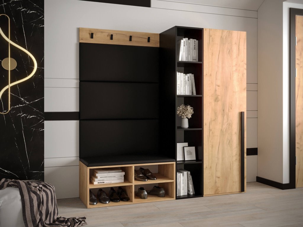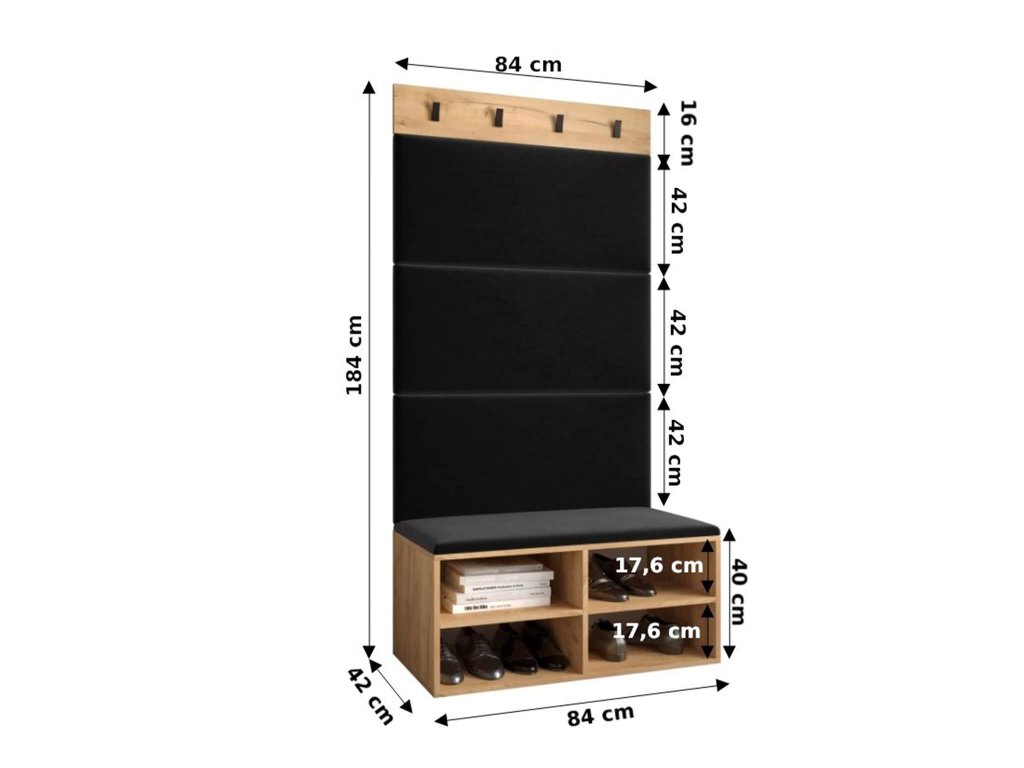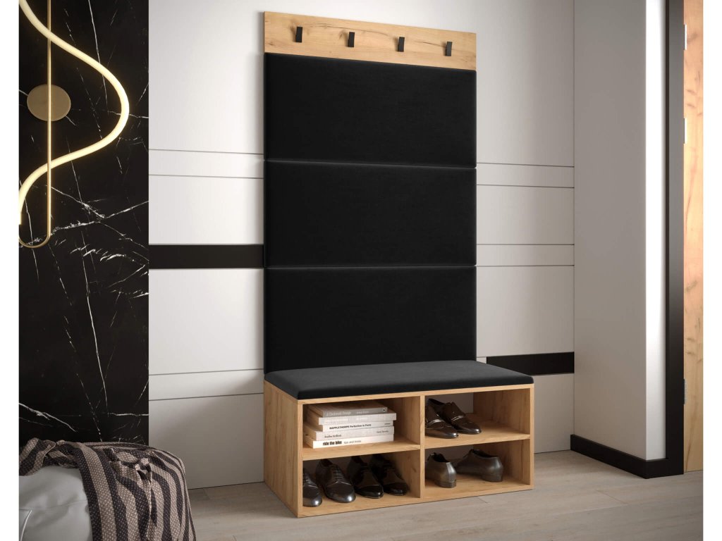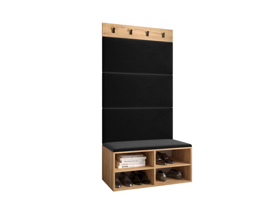 Botník Miro vyrobený v dekore zlatý dub craft spolu s čiernymi panelmi vytvárajú dokonalý celok, ktorý bude krásne vyzerať v každej predsieni či chodbe. Doprajte si pohodlné obúvanie topánok vďaka mäkkým panelom. Náš otvorený botník s podsedákom je skvelým pomocníkom do každej domácnosti. Jeho univerzálne a jednoduché prevedenie dokonale ladí s akýmkoľvek interiérom. Botník je dodávaný so 4 panelmi, ktoré si môžete zalepiť na stenu a tak isto dať na botník. Vešiakový panel si umiestnite podľa vašich preferencií. Čalúnené panely na botníku sú vyrobené z dosky, s penovým jadrom a čalúnené čiernou látkou. Vešiak na stenu je skvelým doplnkom pre vašu predsieň. Na podstave sa nachádzajú 4 kovové vešiaky v čiernej farbe. Botník je vyrobený z kvalitnej laminovanej dosky s hrúbkou 16 mm a jeho hrany sú chránené PVC dyhou. Zadná časť je vyrobená z HDF dosky. Botník ponúka 4 priehradky na pohodlné usporiadanie vašej obuvi.