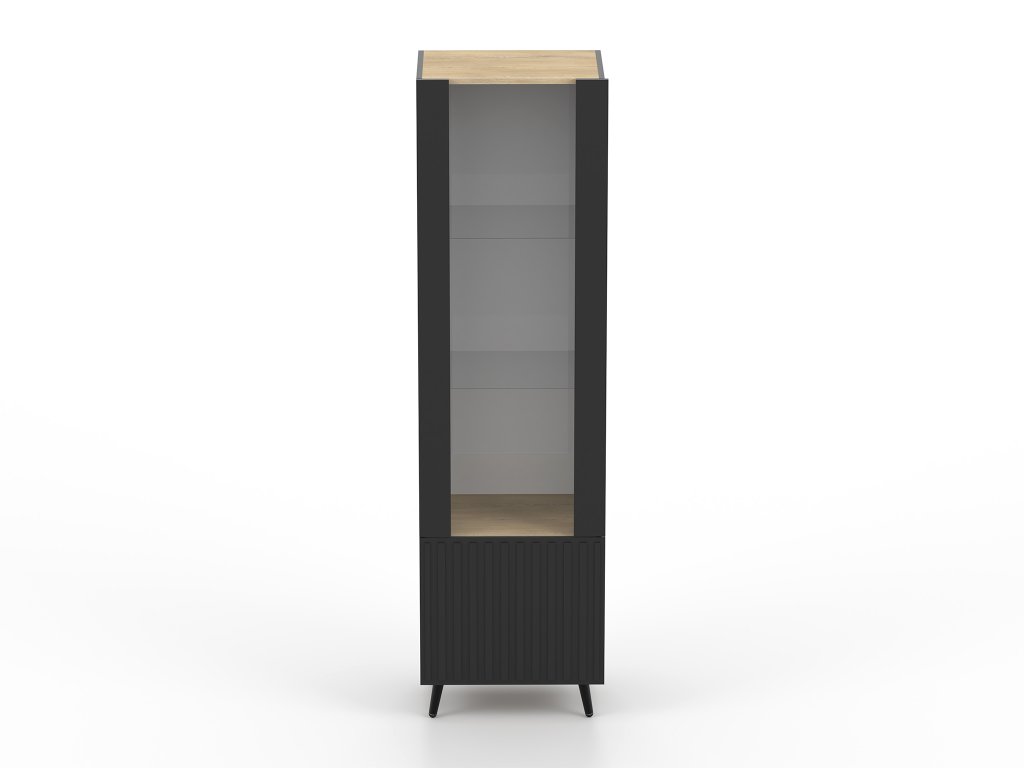 Čierna vitrína Goja 1D je elegantným doplnkom obývačky, ktorý spája moderný dizajn s praktickým využitím. Jednoduché línie a presklená časť s dvoma policami umožňujú krásne vystaviť obľúbené dekorácie, knihy či rodinné suveníry. Uzatvorená skrinka v spodnej časti poskytuje priestor na uschovanie drobností, ktoré chcete mať po ruke, no nie na očiach. Kombinácia čierneho povrchu s detailom v dekore dub Cremona dodáva vitríne elegantný kontrast a hrejivý nádych. Kovové nohy zvýrazňujú ľahkosť konštrukcie a podčiarkujú moderný charakter nábytku.