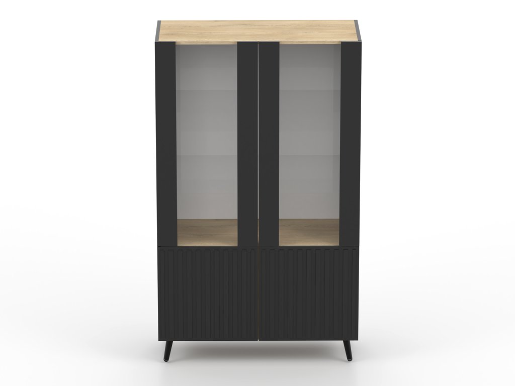 Vitrína do obývačky Goja 2D spája modernú jednoduchosť s praktickým využitím. Dvojdverová konštrukcia ponúka dve široké sklenené police, ktoré sú ideálne na vystavenie riadu, dekorácií či rodinných spomienok. Spodná časť vitríny ponúka praktický uzavretý priestor, v ktorom ľahko uschováte všetko, čo chcete mať poruke, ale nie priamo na očiach. Spojenie čierneho matného povrchu s akcentom dub Cremona vytvára elegantný kontrast a do interiéru vnáša pocit tepla. Štíhle kovové nohy zaručujú stabilitu a zároveň pôsobia ľahko a moderne.