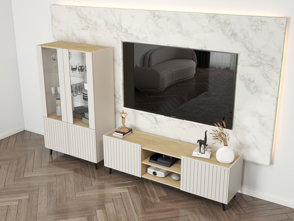 Dvojdverová vitrína Goja 2D v jemnom kašmírovom odtieni spája moderný dizajn s praktickým riešením pre váš domov. Vďaka presklenej hornej časti ponúka priestor na vystavenie obľúbených dekorácií, kníh či elegantného skla, zatiaľ čo spodná uzavretá časť ukryje všetko, čo chcete mať po ruke, ale nie na očiach. Kombinácia teplého dekoru dub Cremona s kašmírovým povrchom vytvára harmonický kontrast, ktorý pôsobí prirodzene a vkusne. Tento kúsok sa stane decentnou, no výraznou dominantou vašej obývačky či jedálne.