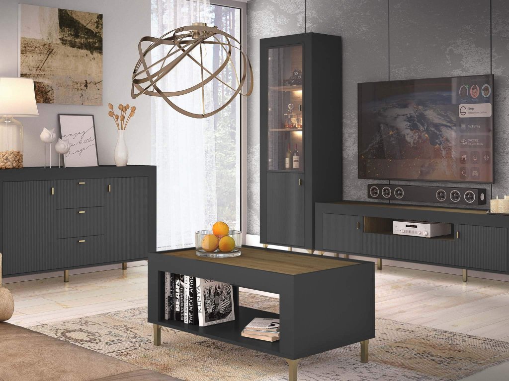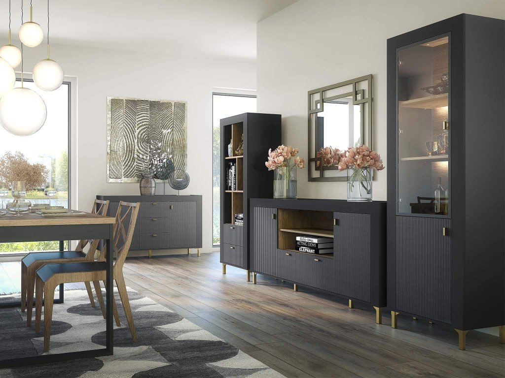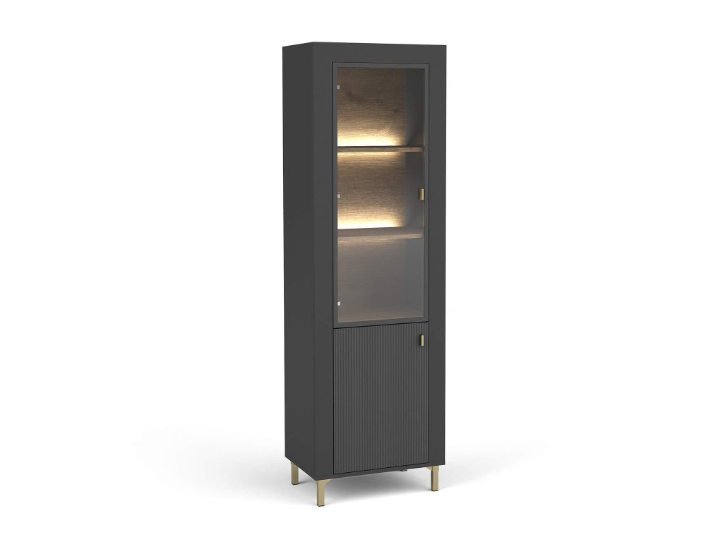 Vitrína Mossa môže byť štýlovým doplnkom aj vášho moderného interiéru. Jej nadčasové čierne prevedenie v kombinácii s jedinečným vrúbkovaným dizajnom na dvierkach zaručuje, že sa stane stredobodom pozornosti. Vnútorný priestor vitríny je ozvláštnený dekórom v odtieni dub whisky, čo pridáva na jej jedinečnosti a osobitom šarme. Vitrína stojí na štyroch vysokých a pevných nožičkách, ktoré zabezpečujú jej stabilitu a uľahčujú čistenie okolo nej aj pod ňou. Tento elegantný nábytok nie je len vizuálne atraktívny, ale aj veľmi praktický. Vnútro vitríny ponúka štyri priestranné police, ideálne na uloženie dekorácií, cenností, okrasného riadu, kníh alebo iných vecí. Horné tri police sú viditeľné cez presklené dvierka, zatiaľ čo spodná polica poskytuje diskrétny úložný priestor.