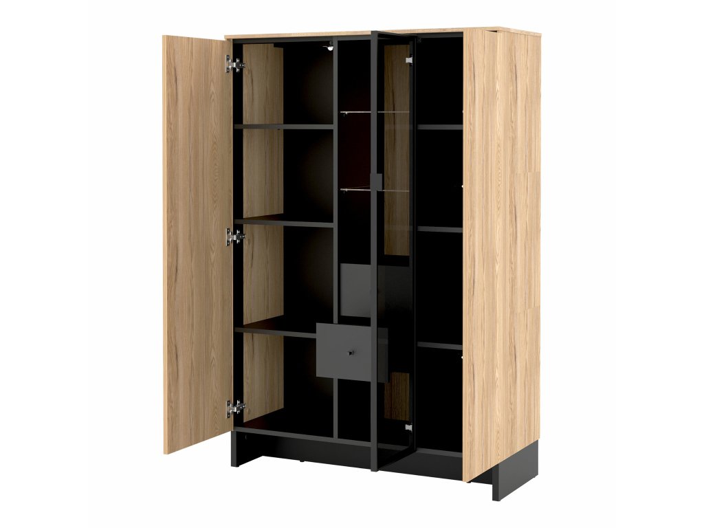 Vitrína Nomad ND-06 je elegantná sklenená vitrína, ktorá nájde svoje miesto v moderných obývacích izbách alebo jedálňach. Jej dizajn kombinuje praktickosť a štýl – jedno z troch dvierok je vyrobené z grafitového skla Antisol, ktoré dodáva nábytku jemný a sofistikovaný vzhľad. Interiér vitríny ponúka dostatok úložného priestoru, vrátane dvoch praktických zásuviek na drobnosti a poličiek, ideálnych na vystavenie dekorácií či uloženie riadu. Vitrína do obývačky Nomad je dokonalým spojením funkčnosti a moderného minimalizmu, ktorý oživí každý interiér.