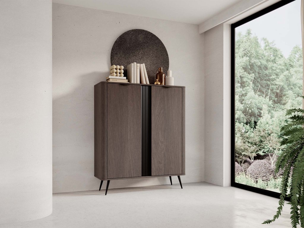 Objavte vysokú komodu Veris, ktorá spája eleganciu s funkčnosťou vo vašej obývačke. Táto drevená komoda v dekore dub dunin je vyrobená z kvalitných materiálov – ryhovaná lišta z MDF dosky a lamely, zaoblené MDF dosky po bokoch a pevné kovové rukoväte s čiernymi nožičkami dodávajú komode nadčasový vzhľad.