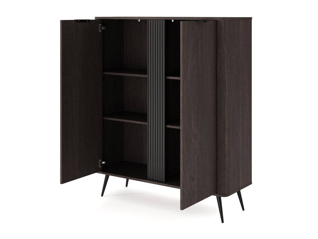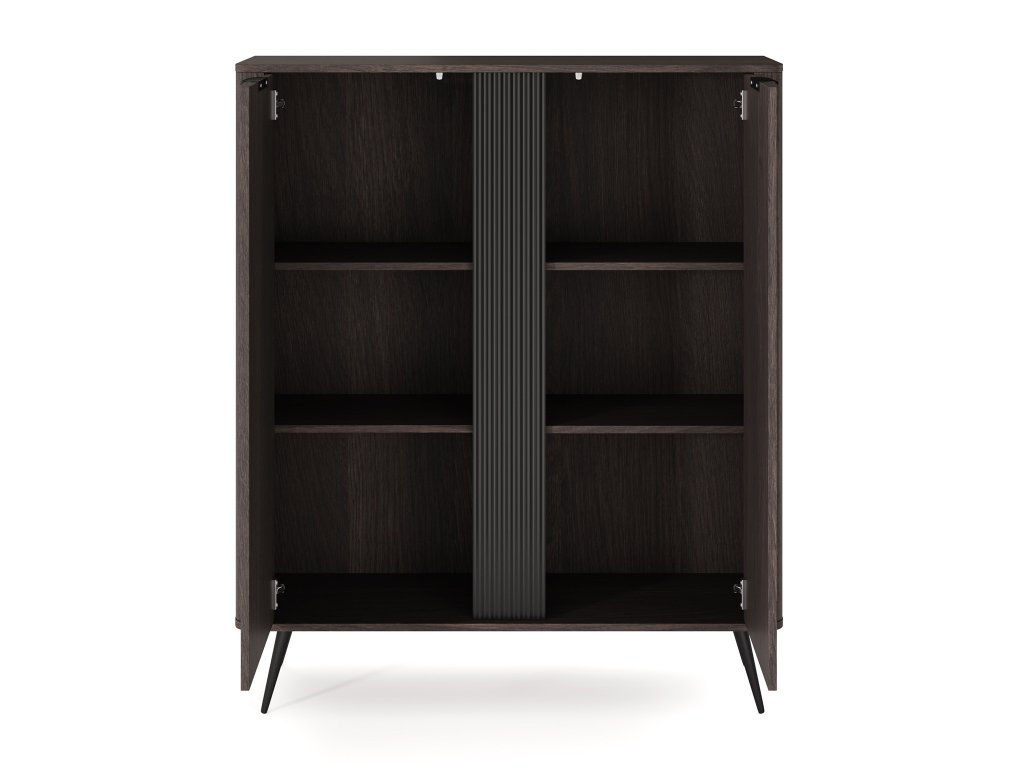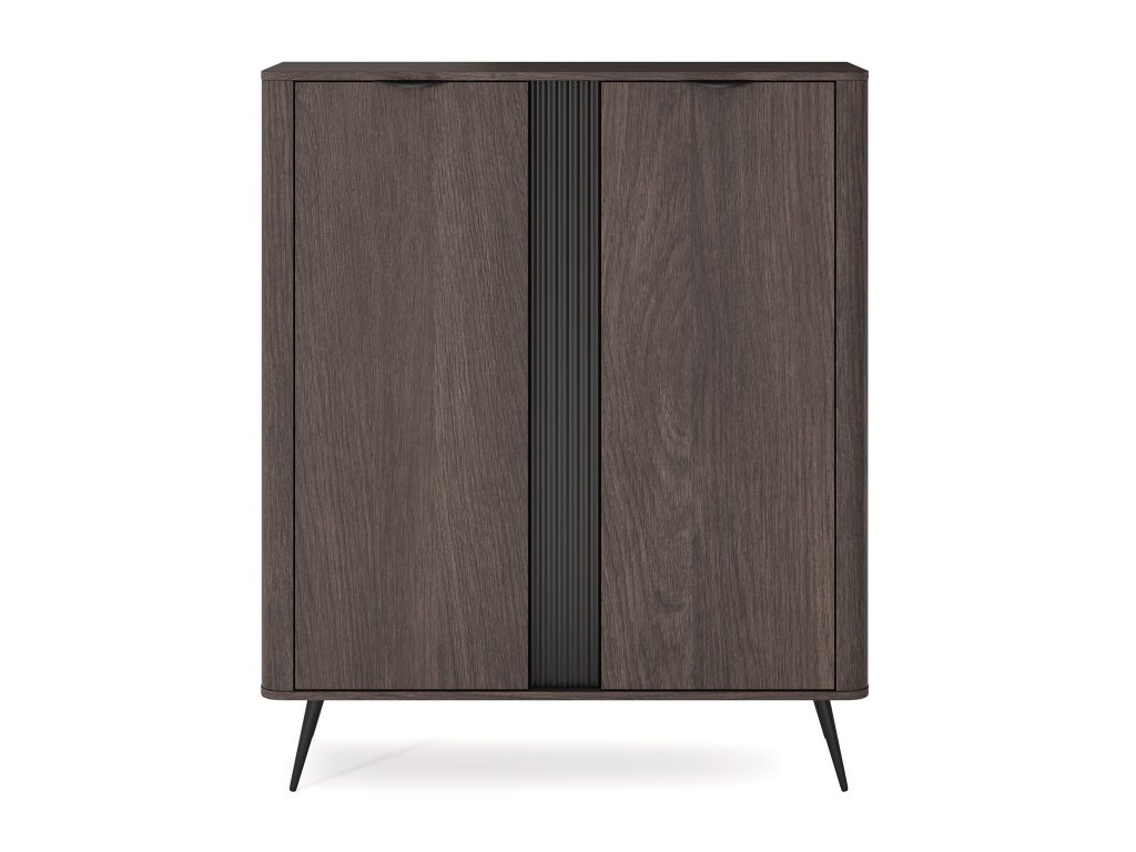 Komoda disponuje dvojicou dvierok s pantovým otváraním, za ktorými sa nachádza niekoľko praktických poličiek pre vaše uložené veci. V strede komody je jemná dekoratívna lišta, ktorá pridáva nábytku sofistikovaný detail. Táto kvalitná komoda sa stane ideálnym riešením do obývačky, spálne alebo predsiene, kde spája štýl a praktickosť.