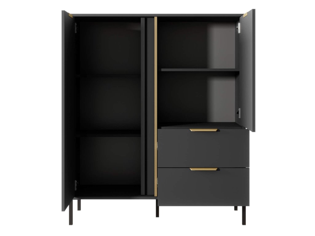 Komoda Lars je moderný kus nábytku, ktorý dodáva štýlový dotyk do každej miestnosti. Je vyrobená z kvalitnej laminovanej dosky, ktorá zaručuje jej trvanlivosť a odolnosť. Antracitová farba dodáva komode elegantný vzhľad a zlaté úchyty pridávajú nábytku nadčasový šmrnc. Komoda Lars je vybavená dvojicou skriniek s poličkami, kde môžete uskladniť svoje veci a dvomi zásuvkami, ktoré poskytujú ďalší priestor pre vaše osobné veci. ABS hrany zaručujú, že nábytok bude odolný voči poškodeniu a kovové nohy zabezpečujú stabilnú a pevnú konštrukciu. Svojou jednoduchosťou a zároveň eleganciou je komoda Lars ideálnym doplnkom pre váš interiér. Bez ohľadu na to, či ju umiestnite do obývačky, spálne alebo do kancelárie, táto komoda sa stane výrazným prvkom miestnosti a zároveň vám poskytne praktické úložné riešenie.