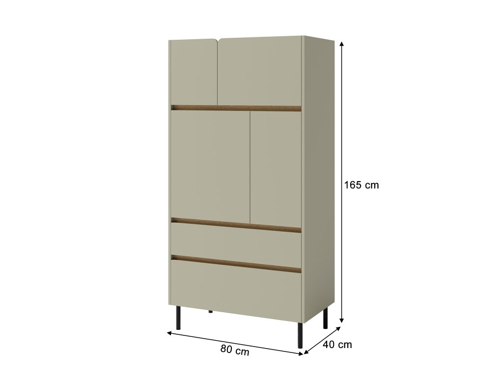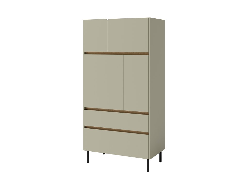 Moderná komoda LUCA vysoká až 165 cm s čiernymi kovovými nožičkami. Jemné detaily vo farbe dub baltic v kombinácii so zelenou farbou v odtieni eukalyptus pôsobia veľmi jemne a elegantne. Pokiaľ sa vám páčia prírodné odtiene, vysoká komoda z kolekcie LUCA stojí za preskúmanie. Komoda vám poskytne veľké množstvo uzavretého úložného priestoru. V spodnej časti komody sú dva veľké šuflíky, nad ktorými sa v hornej časti nachádzajú štyri skrinky s poličkami.