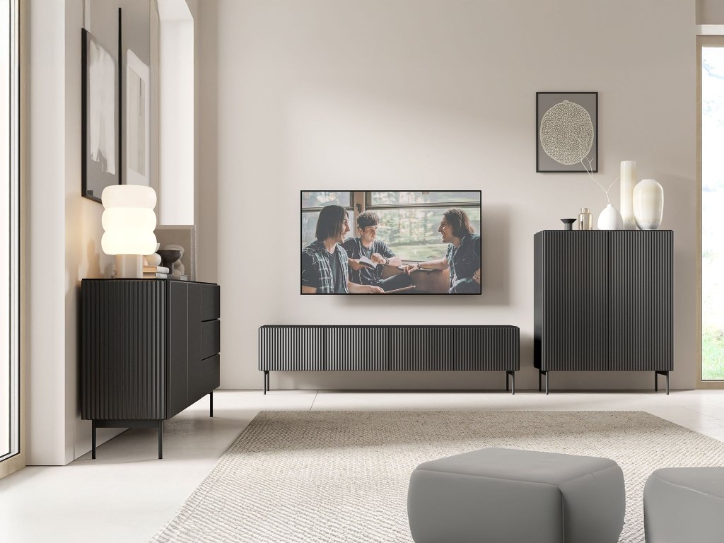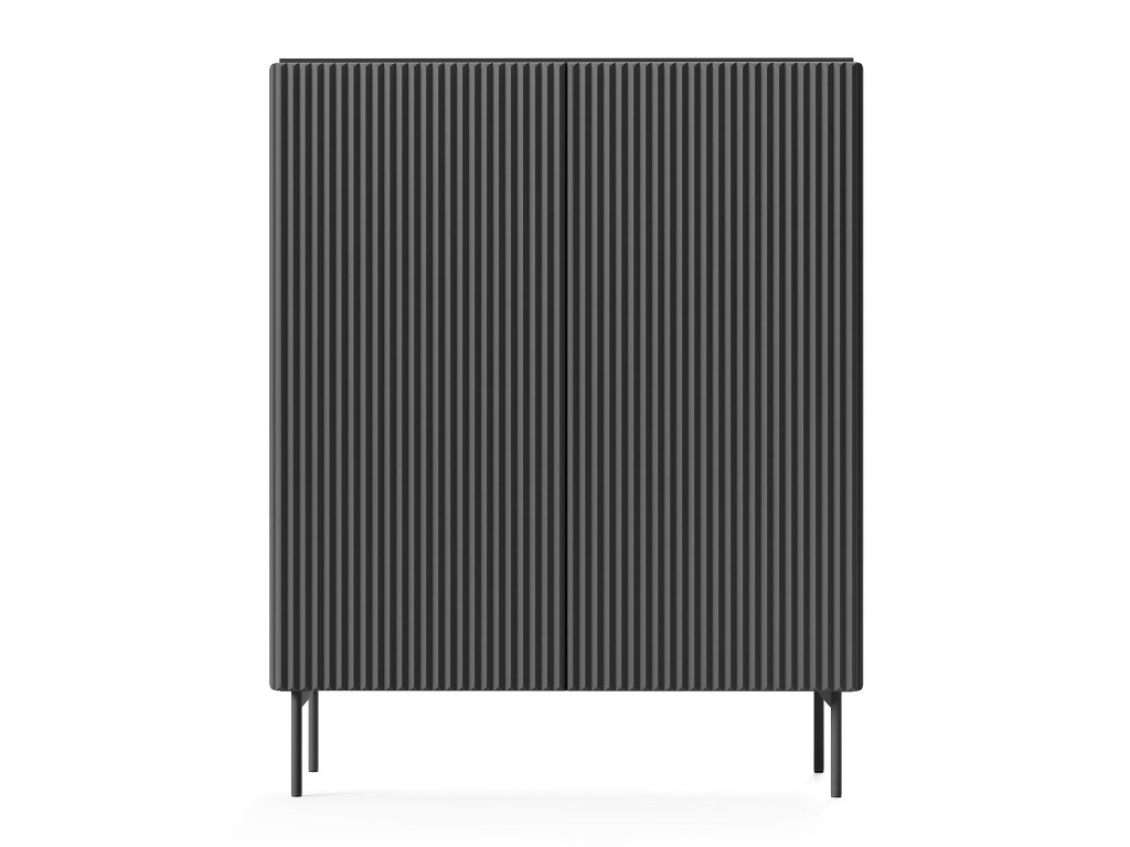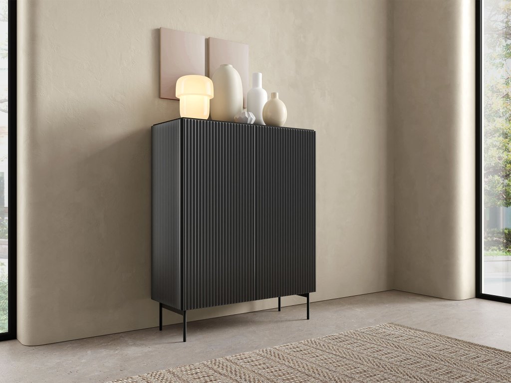 Vysoká komoda MUTI je moderným riešením pre tých, ktorí potrebujú praktický úložný priestor a zároveň chcú dodať interiéru štýlový akcent. Vďaka svojmu univerzálnemu dizajnu sa skvele hodí ako komoda do obývačky, komoda do chodby či spálne. Kolekcia MUTI sa vyznačuje čistými líniami, nadčasovým vzhľadom a dvoma elegantnými farebnými prevedeniami, medzi ktorými nechýba výrazná čierna. Dominantným prvkom komody sú vertikálne drážkované dvierka, ktoré jej dodávajú dynamický a súčasný vzhľad. Minimalistický charakter ešte viac podčiarkuje bezúchytkové otváranie push-to-open, vďaka ktorému pôsobí celý kus nábytku mimoriadne elegantne a moderne.