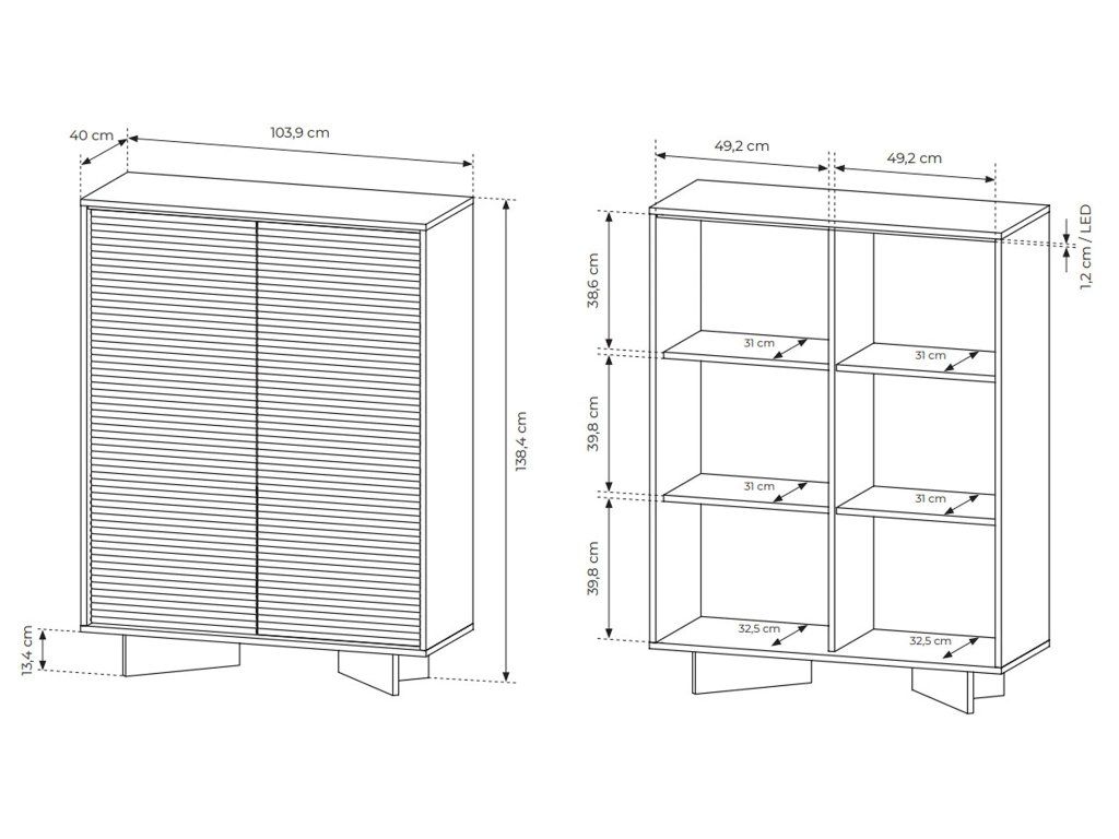 - Materiál: 18 mm laminovaná doska / drážkované MDF predné plochy / ABS hrany