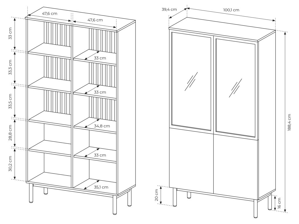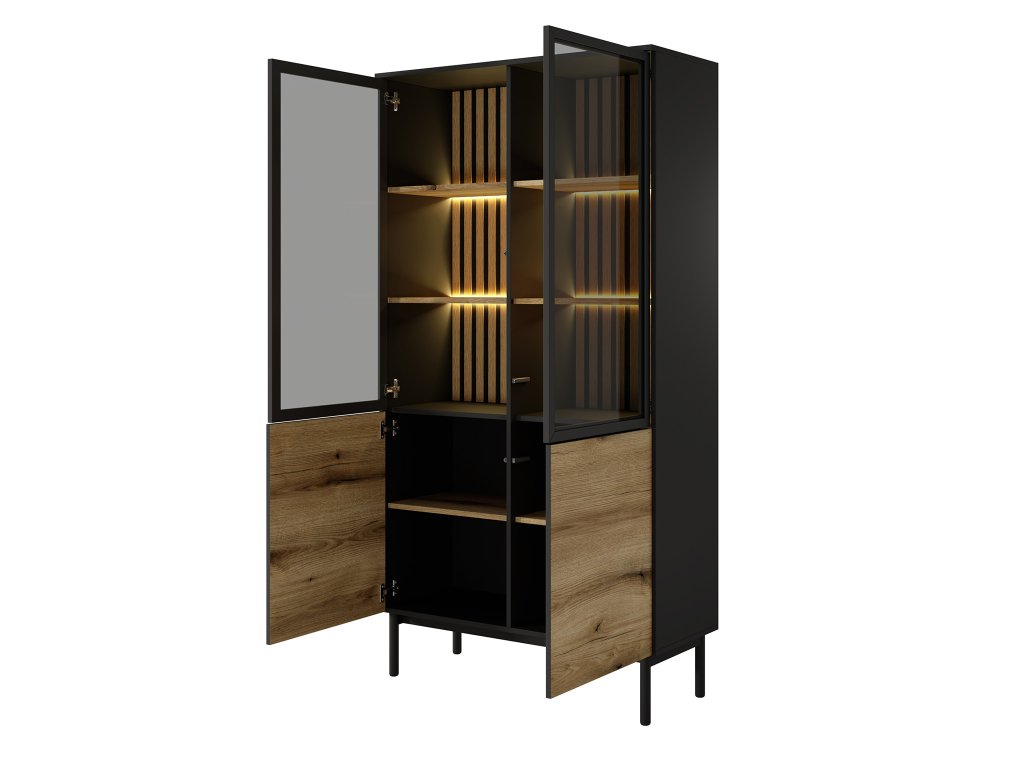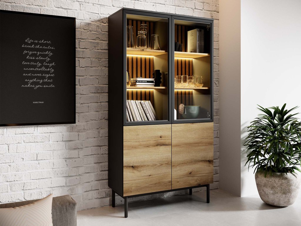 Vysoká vitrína Lango je elegantným prvkom modernej obývačky, ktorý spája štýlový vzhľad s praktickým využitím. Kombinácia čiernej farby a dekoru dub evoke vytvára výrazný kontrast, ktorý pôsobí nadčasovo a dokonale zapadne do industriálnych, škandinávskych aj minimalistických interiérov. Horná časť vitríny je presklená, takže môžete vystaviť svoje obľúbené dekorácie, knihy či dizajnový riad. Teplé LED osvetlenie dodáva každému detailu hĺbku a vytvára príjemnú atmosféru počas večerných hodín. Spodná časť vitríny ponúka uzavretý úložný priestor, ideálny na predmety, ktoré chcete mať po ruke, no nie na očiach. Celková kapacita vitríny z nej robí praktického pomocníka do obývačky, jedálne či pracovne.