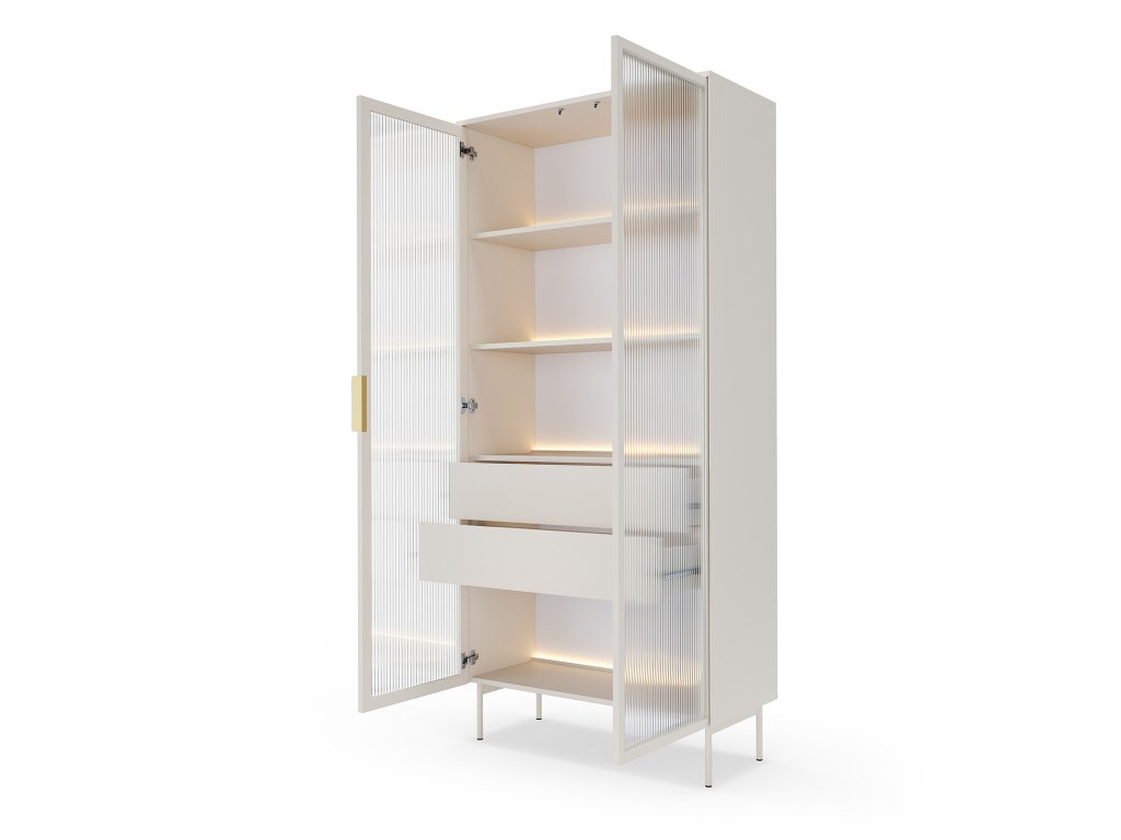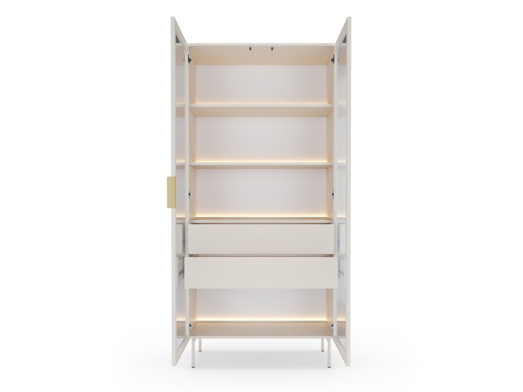 Vysoká vitrína LIMU 91 2D2S v jemnom kašmírovom prevedení pôsobí exkluzívne a zároveň dizajnovo. Predné dvierka zo sklenených, tvrdených panelov dopĺňajú decentné rámiky, ktoré zvýrazňujú jej čisté línie. Vo vnútornom priestore nájdete praktické poličky na dekorácie či knihy a dve hladko vysúvateľné zásuvky s kvalitnými výsuvmi, ideálne na uloženie drobností. Celkový vzhľad dotvárajú elegantné zlaté úchytky a vysoké nožičky, ktoré vitríne dodávajú moderný charakter. O atmosféru sa postará integrované teplé biele LED osvetlenie, ktoré krásne zvýrazní vystavené predmety.