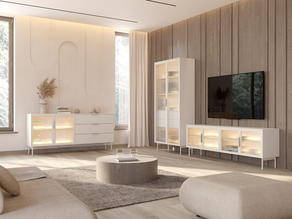 Táto vysoká vitrína kombinuje odolné materiály, jednoduchú údržbu a dizajn, ktorý okamžite pritiahne pozornosť. Ako vitrína do obývačky ponúka praktické usporiadanie, elegantný vzhľad a nadčasovú jemnosť kašmírovej farby. Skvele doplní moderný interiér a dodá mu pocit luxusu aj harmónie.