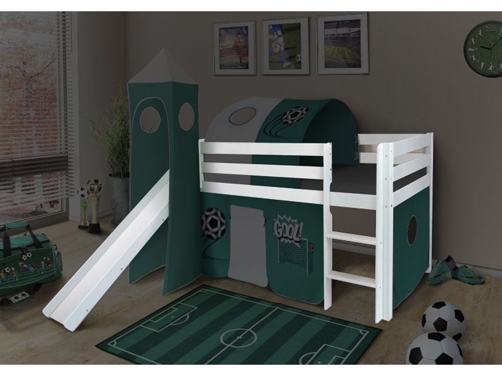 Vstať a môcť sa rovno šmyknúť dolu z postele na šmykľavke je pravdepodobne sen nejedného dieťaťa. Ak však váš syn, no pokojne aj dcérka, našli záľubu vo futbale, touto posteľou im určite vezmete dych. Vyvýšená posteľ s futbalovými motívmi a spomínanými doplnkami namotivuje každého budúceho šampióna Premier League. Priestor pod postieľkou nemusí slúžiť len ako úložný, ale pokojne aj ako provizórna futbalová bránka. Posteľ máme okrem bielej v ponuke aj v ďalších farebných vyhotoveniach. Ak vás neoslovil futbalový motív, môžete si vybrať iný.