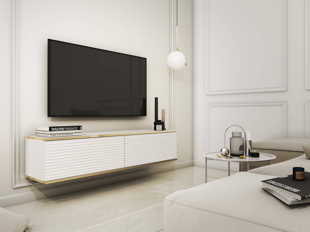 Objednajte si TV stolík Oro, predstavujúci moderný kúsok nábytku, ktorý kombinuje funkčnosť s eleganciou. Jeho žiarivá biela farba dodáva priestoru očarujúci vzhľad, zatiaľ čo šírka 135 cm poskytuje dostatok miesta pre vašu televíznu zostavu a ďalšie zariadenia. Telo stolíka je vyrobené z laminovanej drevotriesky a je ohraničené ABS hranami, čo zaručuje trvanlivosť a odolnosť voči poškodeniu. Stolík disponuje dvomi vyklápacími skrinkami, ktoré majú drážkované dvierka z MDF dosky. Tento detail pridáva nábytku textúru a zaujímavý vizuálny efekt. Zlaté lemovanie na hranách stolíka dodáva jemný akcent a dotvára luxusný dojem. Oro je navrhnutý tak, aby sa zavesil na stenu, čo vytvára ilúziu plynulého priestoru a umožňuje ľahké upratovanie pod ním. Jeho systém push-to-open bez úchytiek prispieva k čistému a minimalistickému dizajnu, kde stačí jemný stláčací pohyb na otvorenie skriniek. Výsledkom je TV stolík, ktorý kombinuje moderné prvky, praktickosť a estetiku. Oro sa stane stredobodom vášho obývacieho priestoru a prinesie do neho dotyk elegancie a štýlu.