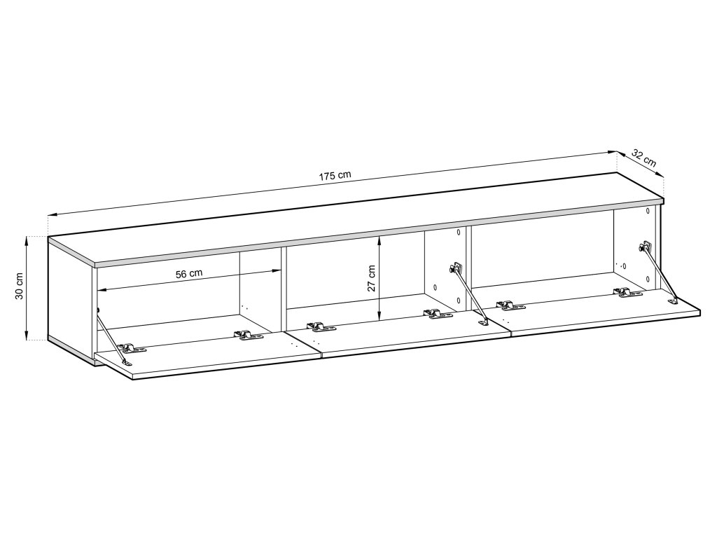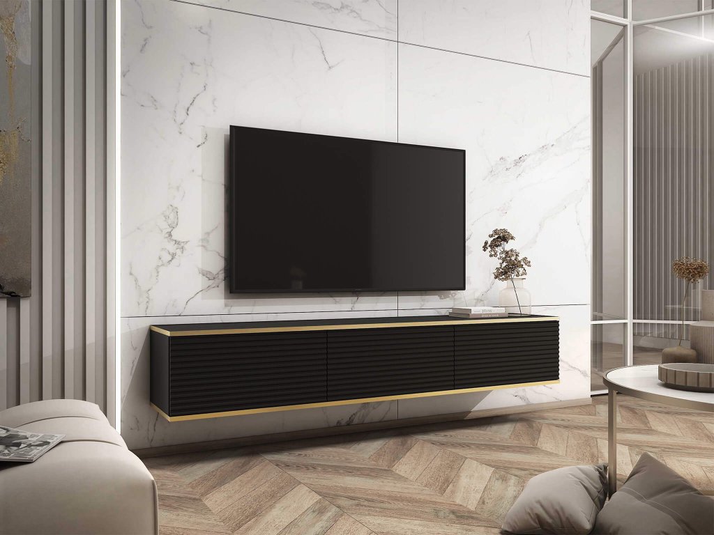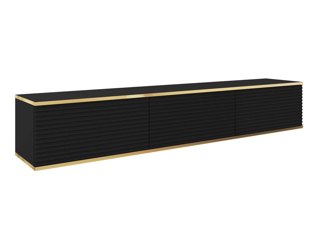 Toto je TV stolík Oro, moderný a elegantný doplnok, ktorý skvele zapadne do vašej domácnosti. S jeho minimalistickým dizajnom a funkcionalitou prinesie do interiéru štýlový dotyk. Tento TV stolík je dostupný aj v čiernej farbe, čo mu dodáva čistý a sofistikovaný vzhľad, ktorý sa hodí k rôznym interiérovým štýlom. So šírkou 175 cm poskytuje dostatok miesta pre váš televízor a ďalšie audiovizuálne zariadenia. Telo stolíka je vyrobené z kvalitnej laminovanej drevotriesky, ktorá zabezpečuje trvanlivosť a odolnosť. ABS hrany zabezpečujú, že okraje stolíka sú dobre chránené pred poškodením. Stolík disponuje dvomi vyklápacími skrinkami, ktoré majú drážkované dvierka vyrobené z MDF dosky. Tieto dvierka pridávajú stolíku jemný vzor a textúru, zatiaľ čo zlaté lemovanie dodáva štýlový a luxusný dotyk. Systém push-to-open bez úchytiek zabezpečuje hladké a bezproblémové otváranie a zatváranie skriniek. Oro TV stolík je navrhnutý tak, aby sa zavesil na stenu, čo prispieva k priestorovému dojmu a uľahčuje čistenie pod stolíkom. Absencia nožičiek dáva stolíku ľahký a plávajúci vzhľad. S touto kombináciou štýlu, funkcionality a kvality je TV stolík Oro skvelou voľbou pre tých, ktorí hľadajú moderný a praktický kus nábytku pre svoju obývaciu izbu.